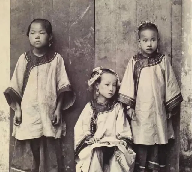 三个小丫头靠着木门站,衣袖宽大到手背,发髻两边压着小花,最中间那位坐着,眼睛一抬像在等大人招呼,童年的稳重就被这么定住了,清淡的布料把稚气裹得严。