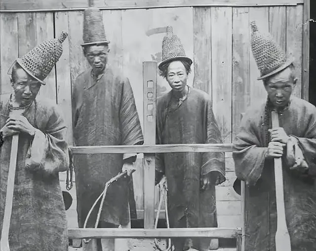 头上这锥形帽好认,手里拿的板子与鞭子更扎眼,木架横着,几个人分站两边,场面肃着不热闹,旧时刑具就这么摆在天光下,让看的人发怵,被罚的人咬牙挺。