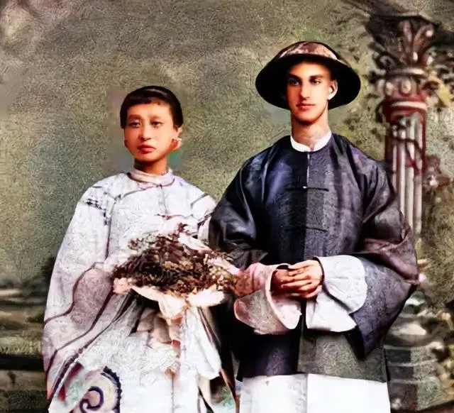 这张叫合婚照,左边衣纹细密,手里捧花,右边的人穿圆帽长袍,神色新鲜,背景是画布与柱台,既像影楼摆拍,又有点彼此不适应的拘谨,那会儿新旧就在婚礼上碰头。
