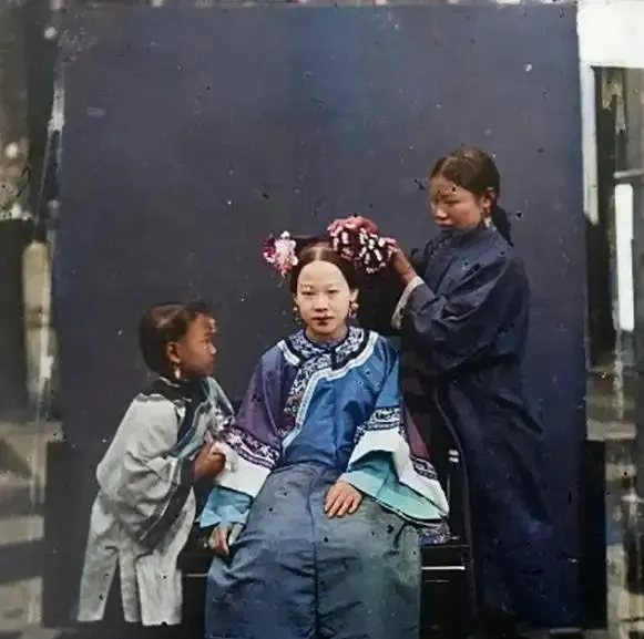 这幕是梳妆,中间的姑娘穿蓝缎面,肩头压着亮银的滚边,一侧小丫头踮脚看热闹,另一侧的把花钿往发上轻按,屋里安静,只能听见发簪碰到檀木梳盒的轻响,以前出门要慢慢齐整,现在一支卡子就走人。