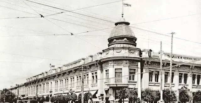 这个转角的楼是新式流线派,墙面一溜竖向的凹槽,窗台窄窄的,边上就是木结构的小礼拜堂,线杆子上瓷瓶子排成串,电车线在头顶划了一个又一个弧,外面看着冷清,其实拐进去有糕点房,玻璃窗里能看到一盘一盘的列巴。