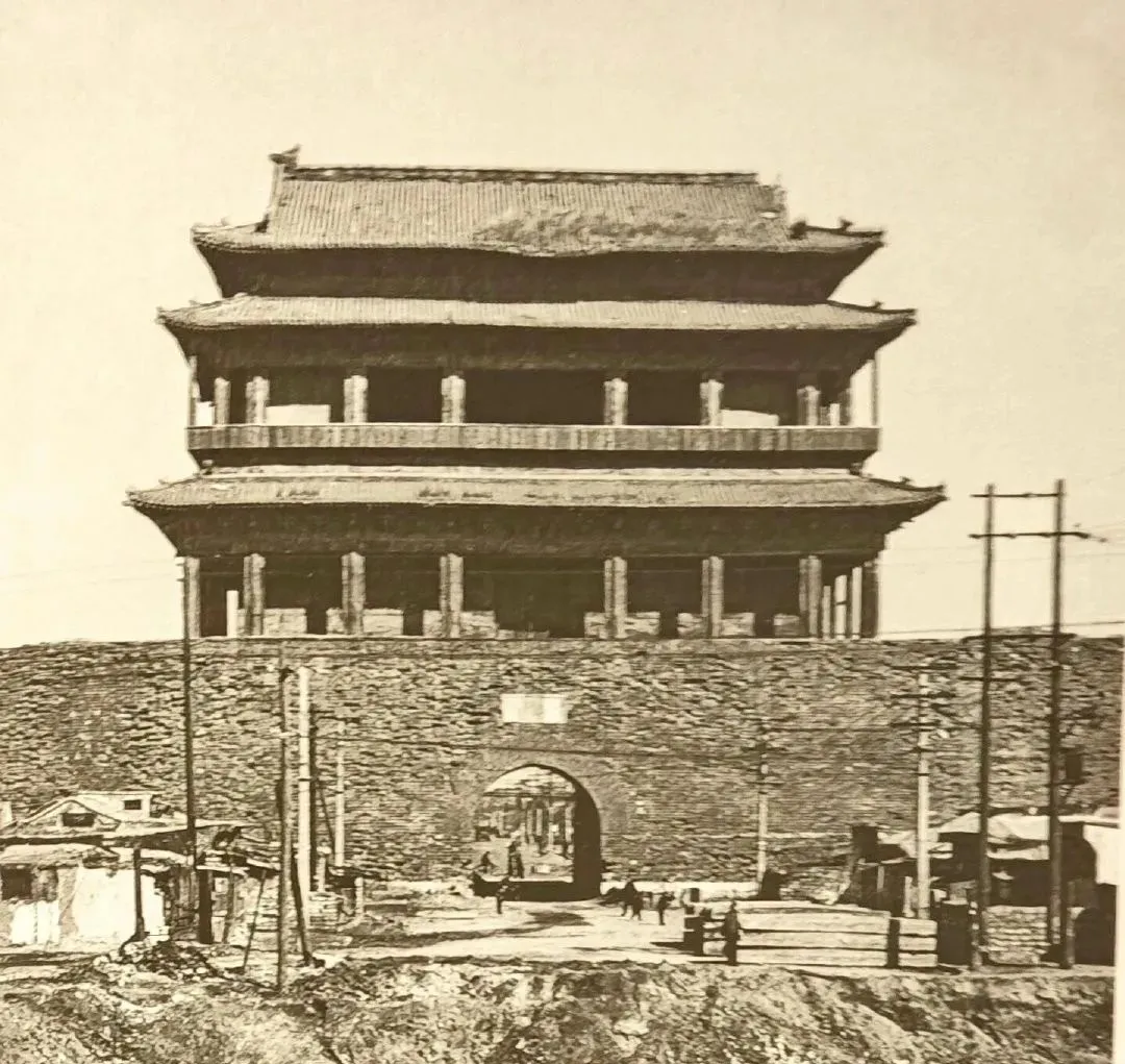 图中这座就是宣武门城楼,青灰的城砖垒到人望不见头,门洞呈半圆拱,城门匾额嵌在正中,三层楼檐一层压一层,琉璃瓦脊线起伏着老北京的气派,门洞里人来人往,挑担的赶车的都从这儿穿门而过,电线杆瘦高地立在一旁,像是给城门量身高的标尺。