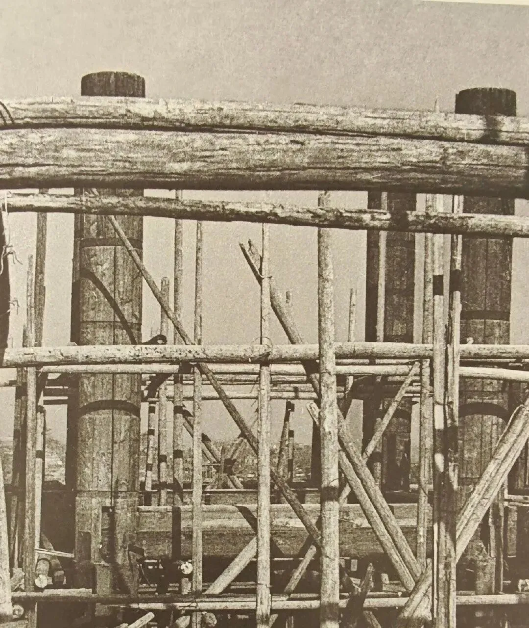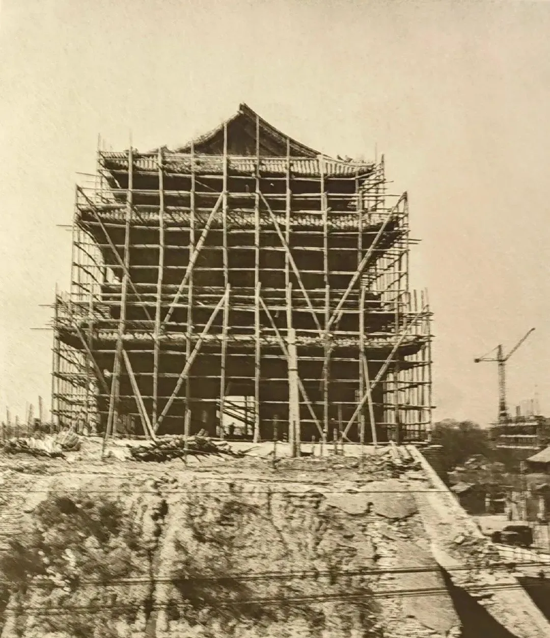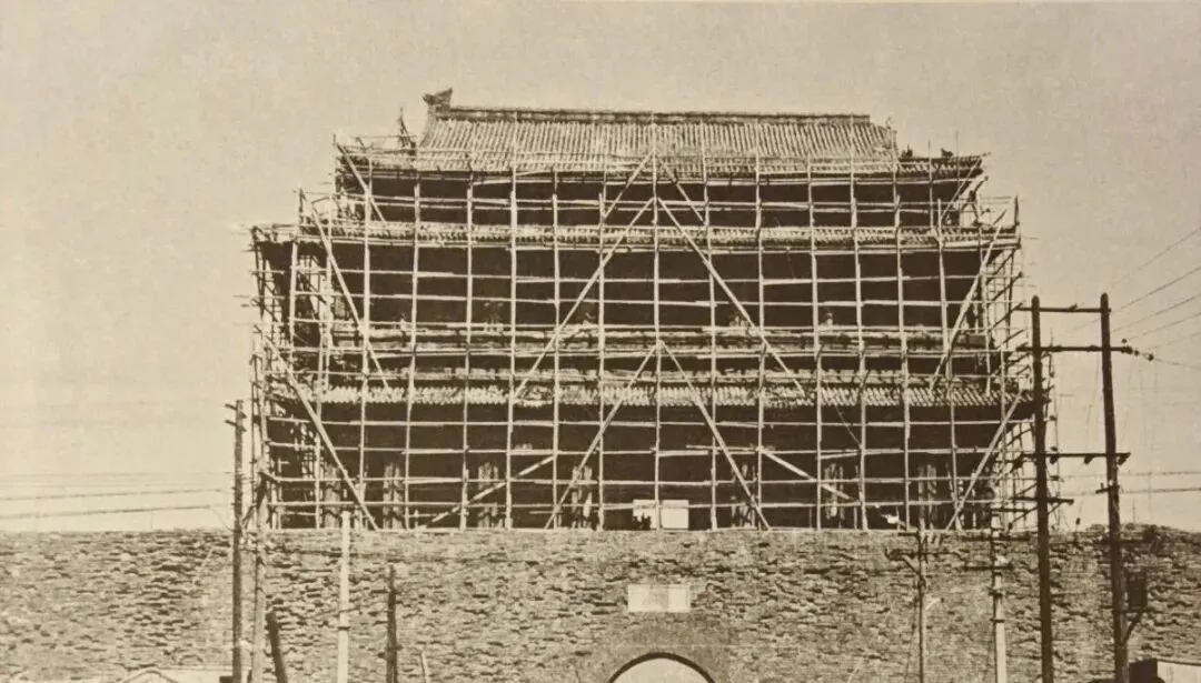这阵仗叫抽梁落架,工人上去先把楼身轻轻卸开,留下粗壮立柱当骨架,柱身被风沙打得发黑,像十几支木桩扎在天上,脚手板吱呀作响,人影在缝隙里移动,城门像褪了外衣的老将,还站着。