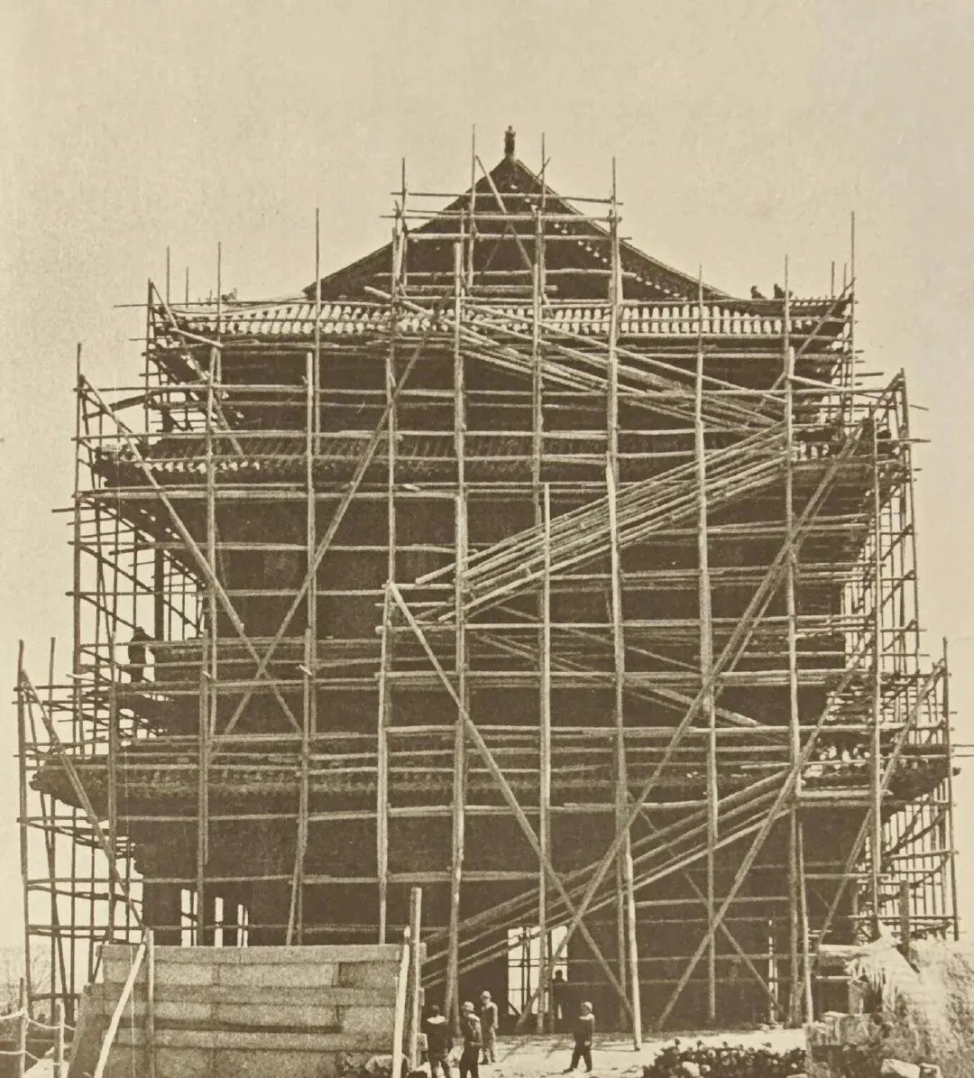 这个密密麻麻的外罩叫脚手架,竹杆木杆十字交叉,绑扎麻绳一匝一匝勒得紧,远看像一口巨大的鸟笼把城楼罩住,师傅们顺着斜梯一截截往上爬,手里攥着榔头撬棍,心里盘着次序,先哪后哪不许乱。