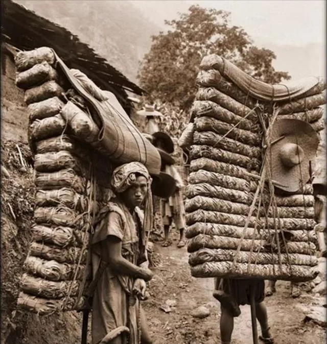 这个力气活儿叫背夫,两边是厚厚的卷垫,绳索一层层勒住,脑门上裹条布,前胸挂根木钩歇气用,山路一扭就陡,鞋底磨得发亮,我看这阵仗心里都直发紧,以前上货全靠人扛,现在卡车一趟就拉走了。