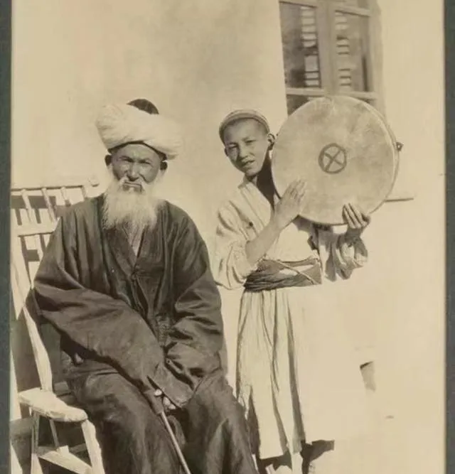 照片里这圆圆的大鼓叫达甫,老人坐着,旁边少年手撑着鼓沿,阳光从墙角打进来,袍子宽大,胡子花白,手掌要贴着皮面轻敲,咚的一声慢慢散开,院子里的人都停下来了。