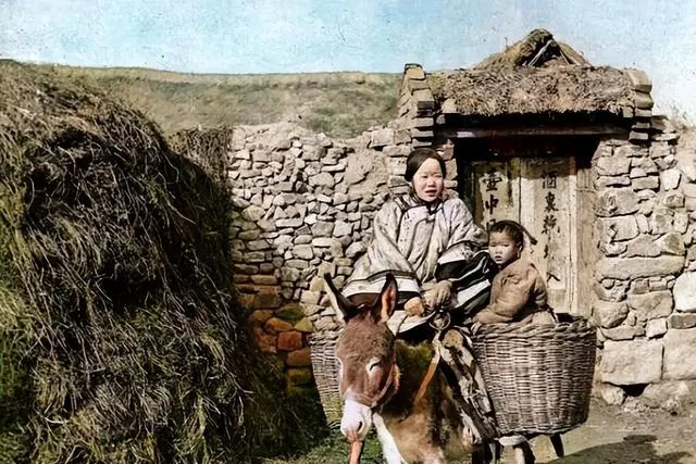 这个出门的场景熟,女人骑着毛驴,两侧是竹篮,孩子窝在里头直探头,石墙门楣上还贴着旧对联,驴耳朵一抖就往前挪两步,妈妈说那会儿谁家要是有头驴,出门赶集可体面。
