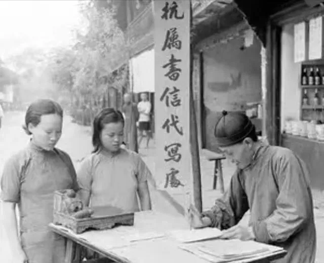 这摆着木案的叫代笔,长条旗写得直直的,砚台里黑得发亮,先生握着毛笔低头写,旁边两个小女孩蹙着眉听字眼,口信一转成楷书,抬手就把心事落在纸上了。