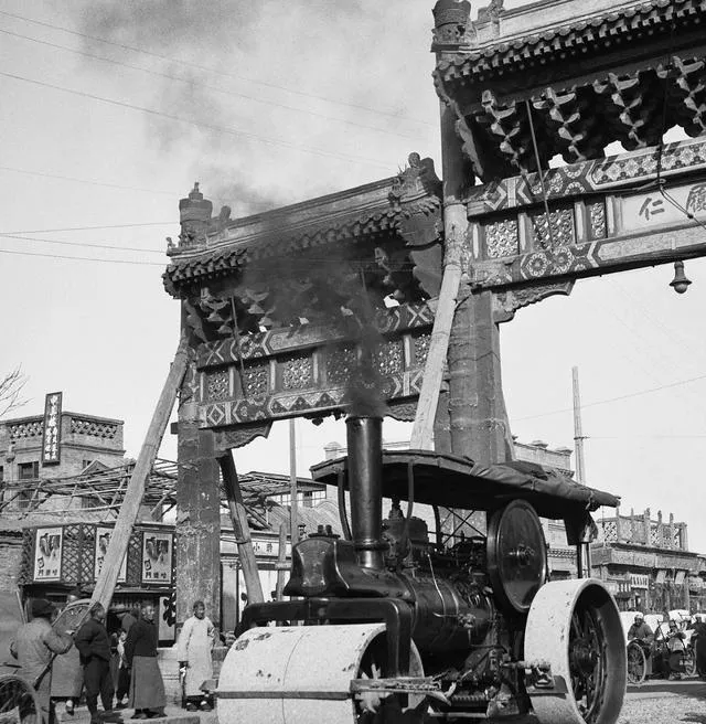 地上冒烟的家伙叫蒸汽压路机,铁轮子碾过,咣当咣当的响,黑烟从烟囱里直往上蹿,街口的大牌楼挤在一边看热闹的人不少,我小时候第一次见这种大家伙,忍不住捂住耳朵又伸长脖子。