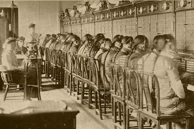这一排靠背椅前都是总机板,从左到右插孔排得齐,年轻人背挺得直,耳朵里塞着听筒,嘴里轻声报号,像唱书一样拖个腔,桌灯一亮一灭,电话世界就这么被串起来了。