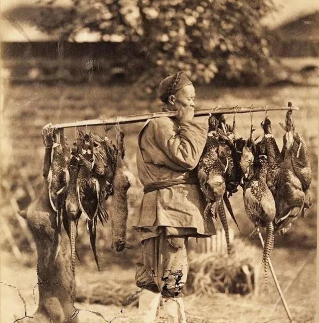 这肩上挑的都是山货,野鸡野兔一串一串垂下,羽毛色发亮,脚边还有只狍子影影绰绰,猎人嘴角叼着一根草,回村口要先过秤,奶奶说秋后这一担能换回整冬的盐巴和火柴,现在这些都归山里自己过了。