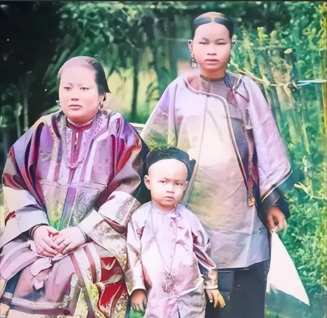 这张着色的老照片里,坐着的是主家太太,旁边站的是奶娘,孩子靠在大人腿边皱着眉,绸衣宽大,领口镶着细边,奶娘手腕粗,目光却温柔,屋里养孩子的规矩多,连喝水都得捧着小银碗。