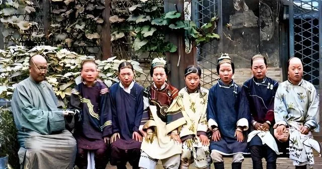 这位穿长袍的中年人身旁坐着一排女子,是正妻和小妾,衣料亮亮的,发髻梳得高,院里栽着葡萄架,影子落在地上分成好几层,家大业大的人,拍照也要坐得端正,笑不出来也不能皱眉。