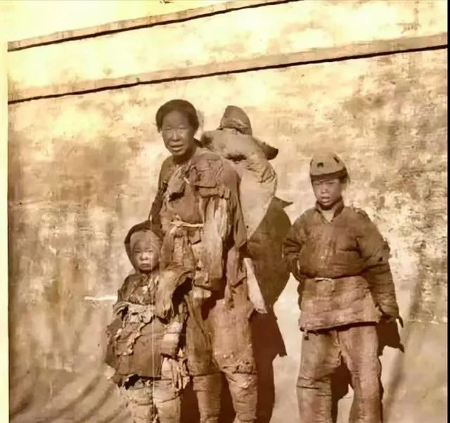 这一家是北平街头的流浪母子,衣衫褴褛,脸上糊着风沙,最小的孩子眼睛大大的盯着镜头不吭声,墙根晒着一点余温,他们靠着彼此挤在一起,妈妈把破毯往上提了提,说走,找口热粥去。