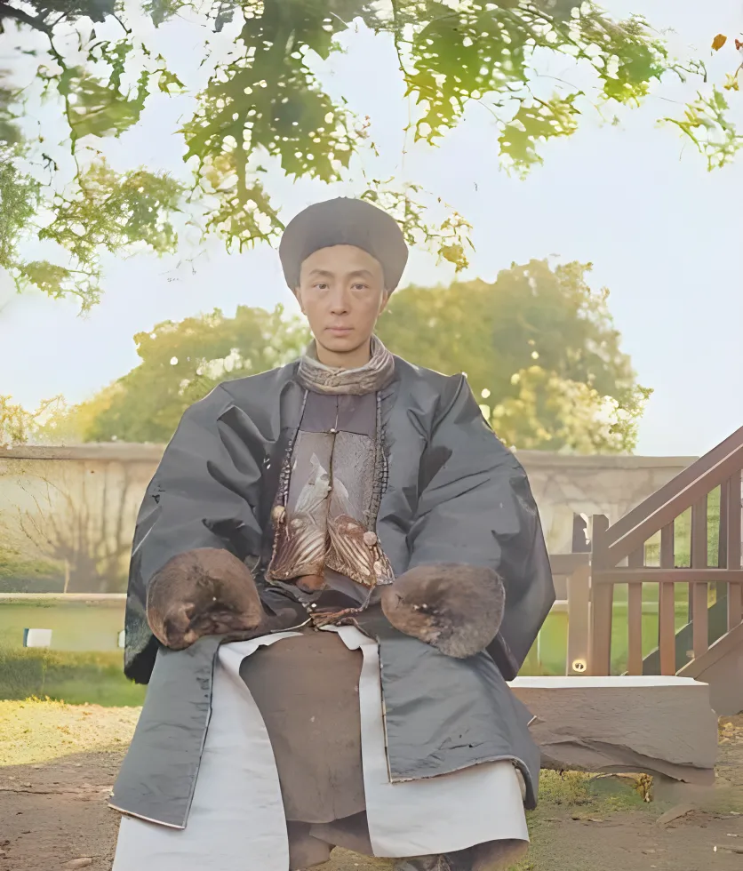 图中这位穿官服的叫八品县丞,胸前那块绣着鹌鹑的方补最显眼,缎面发亮,底色偏墨青,线脚细密得很,鹌鹑两翅一张一合像要飞起来,袖口里垫了毛边,坐姿板正,眼神却不凶,像在厅前等人呈报案情呢,我外公看见这类老照片总会说一句,县里事儿多着呢,补服是门脸,能镇场子。