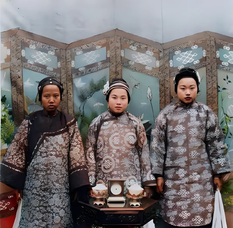 这张里头的三位叫府里侍妾,衣料是亮丝团花,纹样紧凑,立领贴颈,袖口宽宽,站成一排不言不语,脸上雪粉擦得平,背后屏风画着莲叶和水鸟,像专程去照相馆留影的,这类衣裳讲究细节,边上滚的暗银线在光底下一闪一闪的,奶奶看了会说一句,穿得体面,不见得活得体面,一个字也不多说。