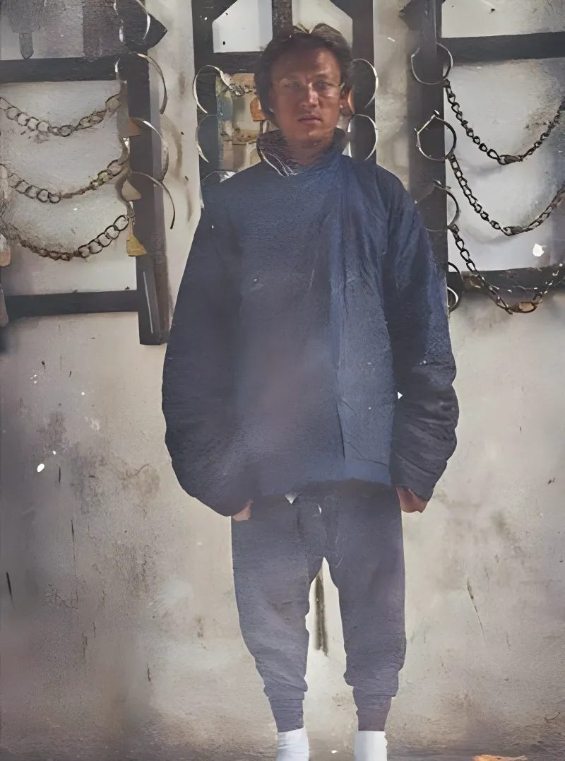 这位被押着站墙根的叫人犯,身后挂着一排铁镣与枷锁,圆环连着铁链,冷光一片,墙面斑驳潮白,脚下影子发沉,照片定住的一瞬里,他像刚被问过话,嘴角紧着,眼里有点倦,不敢多看镜头,外公说从前衙门最怕夜里传呼,半夜鸡叫就出门,回家时天都亮了。