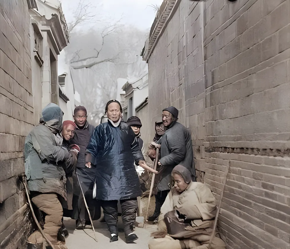 这一幕叫小巷里的人让人,穿绒缎褂子的老妇人迈得稳,乞者贴墙坐着,手里杖子往前一点一点挪,旁人把身子侧过去让条道,脸上不敢多言,空气里起了一层凉气,像冬尾的风,小时候我在胡同口玩陀螺,娘喊我让路,快快快,别挡着人家的轿马,声音里急得很。