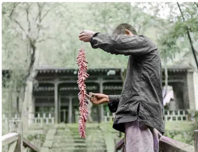 图中一串一串的红纸卷叫鞭炮\u2009,\u2002麻绳穿起一长溜\u2009,\u2002纸壳薄\u2009,\u2002火药不多\u2009,\u2002但密集得吓人\u2009,\u2002一根引线点上去\u2009,\u2002哒哒哒一阵急雨一样炸开\u2009,\u2002小伙拎着绳头手腕一抖\u2009,\u2002烟雾立马漫起来\u2009,\u2002当年婚礼不讲音响不讲出场灯光\u2009,\u2002有这响声就算热闹齐全了。