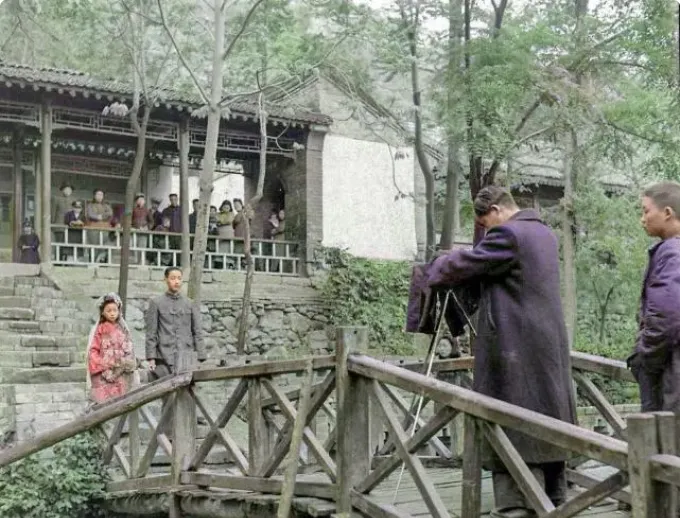 这台黑布罩的大画幅机子一看就沉\u2009,\u2002三脚架扎在桥板上不晃\u2009,\u2002摄影师身子一探\u2009,\u2002手在镜头圈上拧呀拧\u2009,\u2002“别眨眼啊”这句话我仿佛都听见了\u2009,\u2002新人在桥中间站直了\u2009,\u2002背后廊下挤满看热闹的乡亲\u2009,\u2002咔嚓一声\u2009,\u2002历史就被按住了。