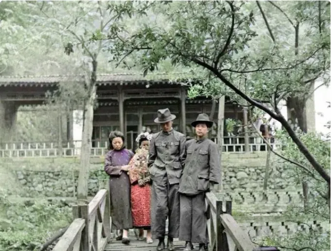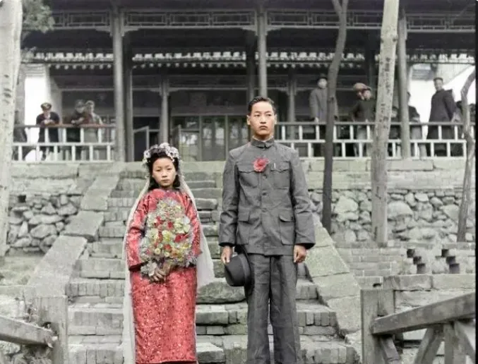 这两位站在灯下\u2009,\u2002新娘头上插花钿\u2009,\u2002绸面一压折子细密\u2009,\u2002新郎穿中山装\u2009,\u2002袖口笔挺\u2009,\u2002手里捏着一顶呢礼帽\u2009,\u2002神情说不上欢腾\u2009,\u2002更多是拘谨\u2009,\u2002那时候婚事大多是长辈做主\u2009,\u2002见面少\u2009,\u2002站一处却不太会说话\u2009,\u2002镜头把那份生分也给照实了。