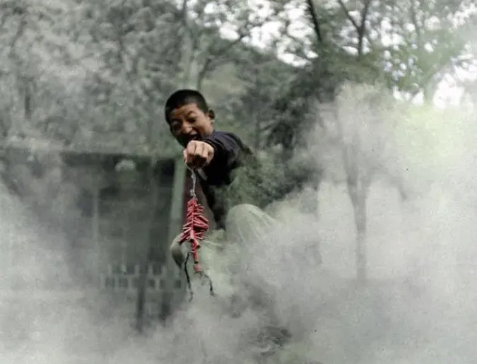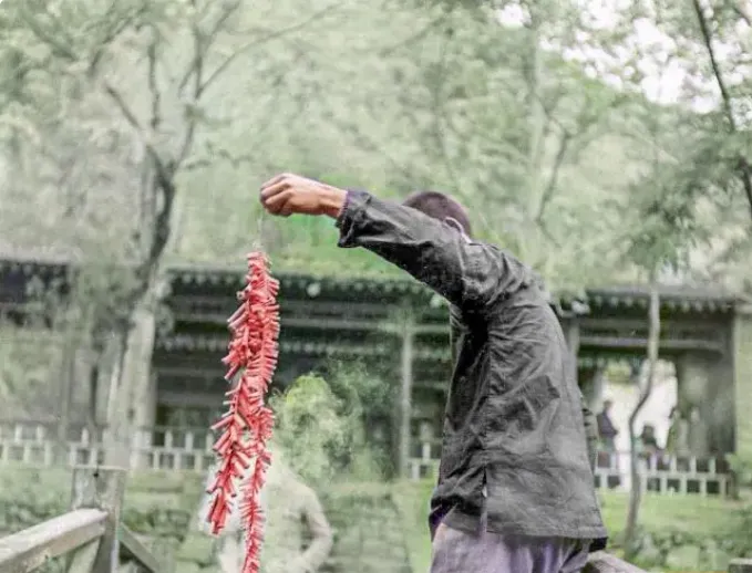这张是桥头的准备\u2009,\u2002鞭炮拎在半空\u2009,\u2002衣角一翻就是风\u2009,\u2002背景里是深檐回廊\u2009,\u2002树影压着屋脊\u2009,\u2002摄影的人估摸着在对焦\u2009,\u2002等那一瞬火星亮起来。