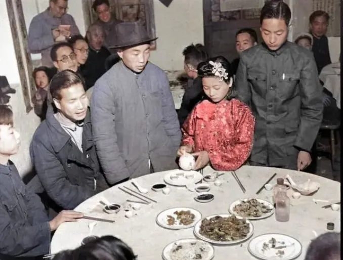 圆桌上这些小碟子装的是料汁和佐菜\u2009,\u2002酱油色最扎眼\u2009,\u2002几个盘子里是时令小炒\u2009,\u2002看样子不算铺张\u2009,\u2002但人一围\u2009,\u2002气氛就到位了\u2009,\u2002新娘穿红绸褂子低着头剥鸡蛋\u2009,\u2002旁边新郎和亲友都盯着看\u2009,\u2002该敬的酒该走的流程一步没少。