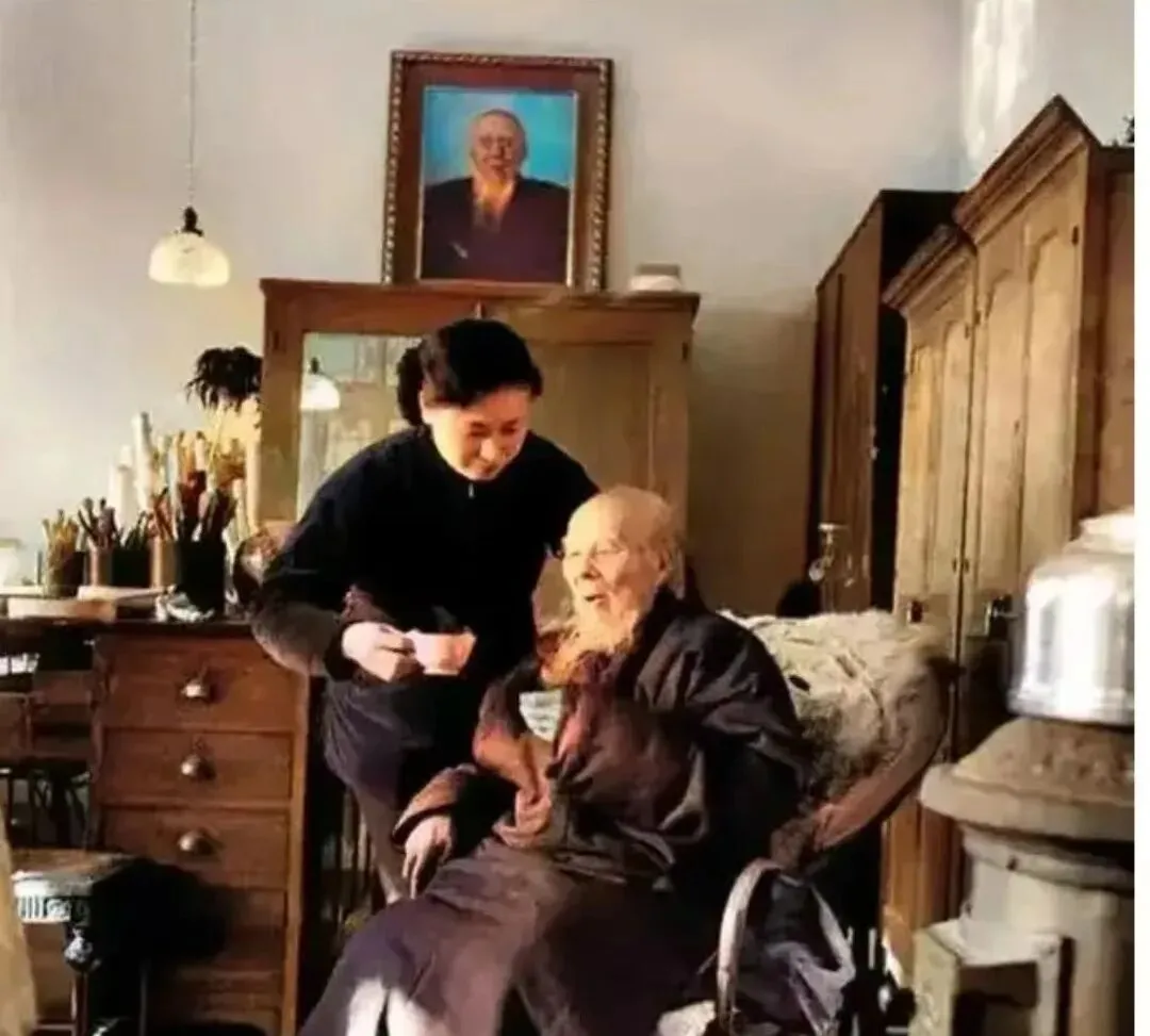 这个温暖的小屋叫老宅的心脏,粗木柜子占了一整面墙,抽屉把手油光锃亮,灯罩是乳白玻璃的,桌上摆着毛笔和水盂,靠椅上坐着的老人笑得像孩子,身旁的人端着茶盏探身过去,屋里那束斜阳真会挑人,顺着墙角落下来,像一只温顺的小猫趴在地上不动,奶奶看了这张说,“家里有光,人心就不冷”。