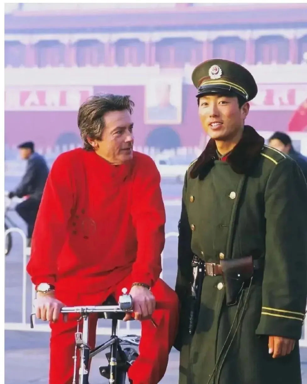 图里这位老外一身红衣坐在车梁上,车把镀铬的,反着亮光,旁边穿军绿大衣的小伙子站得笔直,腰间的皮带扣圆得像月亮,他们凑在一起聊得正欢,路面干净,人影稀疏,我想起小时候的二八大杠,骑起来哐当哐当的,弯把一拧就窜出去,现在的车轻巧是轻巧,就是少了点金属该有的“铿锵”。