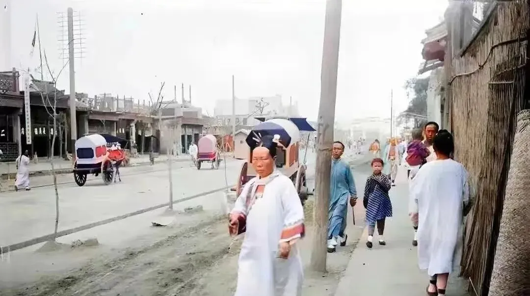 这个街景叫东城的日常,灰墙黑瓦,门脸儿一溜连过去,脚边是还没铺好的路槽,黄包车的帘子支着,行人衣摆被风拽着往后飞,最抢眼的是走在前头的那位穿白袍的中年人,脚步生风,像是去赶一桩急事,那时候的城市慢慢悠悠里也有急,和现在地铁里挤成一团的急不一样。