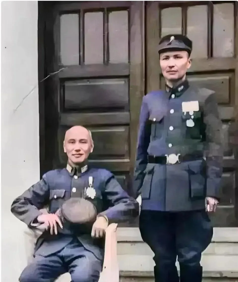 这个组合镜头里两身制服挺括得能立起来,胸前章带闪着冷光,一位坐着,一位站着,背后是木门和台阶,木纹被磨得发亮,帽檐压低了眉骨,神气里透着一股子“要紧”,我小时候最爱看制服上的扣子,圆圆的,摸起来冰凉,现在看多了运动外套,倒有点怀念这种“关于挺拔”的质感。