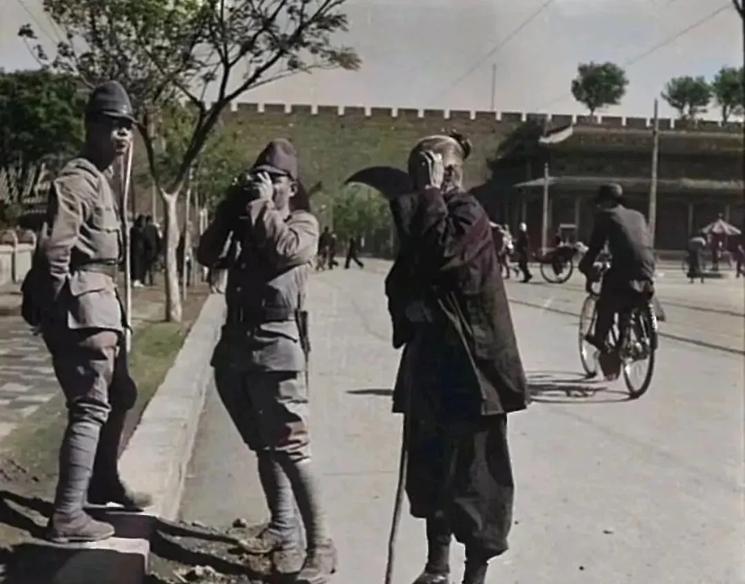这张抓拍很有意思,两名士兵站在路牙子上,一个举着相机按快门,旁边的老人手搭凉棚朝这边看,手杖钉在地上,另一边自行车的影子从阳光里晃过去,墙头压着一排小树,叶子被风翻得发亮,照片像一记闷鼓,把喧嚣和安静敲在同一处,以前街景靠脚步丈量,现在靠缩放手势,可人和人的对望,永远只发生在一臂之距。