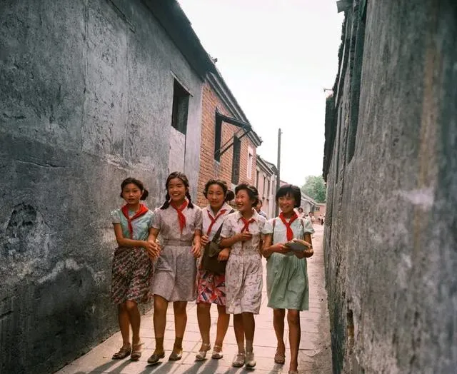 这群扎着红领巾的姑娘们,走在窄巷里胳膊挽着胳膊,裙摆有碎花有格子,脚上白球鞋踩得轻,阳光从墙头打下来一条,放学路上谁家新买了橡皮谁就成了队伍里最热闹的那一个,我小时候见到这种画面,心里就觉得一天已经圆满了。