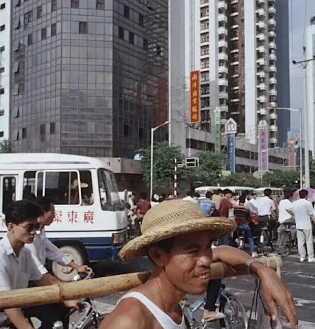 这会儿的路口人多车也多,挑担的汉子麦色皮肤,草帽压得低低的,后头是玻璃幕墙的新楼,公交报站声一阵一阵地飘,城里节奏快起来,早上七点半就堵得厉害,他在红灯边打个盹,绿了就抬腿走,城市和肩膀一起往前拱。