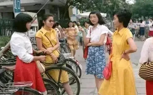 这组街头小聚,裙子颜色明快,红的黄的和蓝花的,四个人围着一辆二八自行车说话,手一插腰就有主意了,可能是约午饭也可能是安排明天的事,街角小卖部塑料袋被风扯得哗啦啦响,日子简单但不枯。