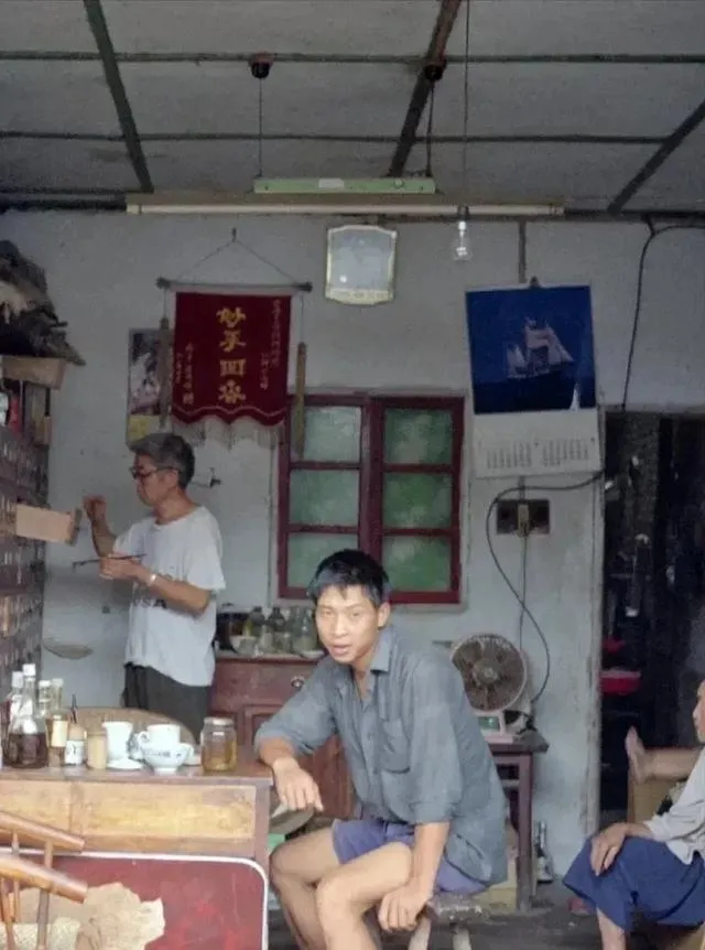 这间屋子是老诊所,墙上挂着锦旗和日历,抽屉格子里装着散发草药味的小纸包,医生戴着老花镜找方子,前面坐着的汉子抿着茶杯等叫名,电扇叶子有点灰但吹得实在,门口有人探头问今天还开不开针灸。