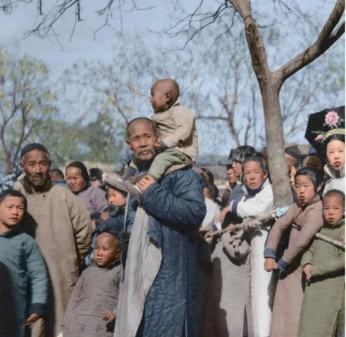 图中这群人的穿戴一看就老,北京城里常见的长衫棉袄,深蓝灰土色挤在一块儿,孩子最抢眼,直接骑在爷们儿肩上当瞭望台,老辈人爱这么扛娃,省劲也稳当,喊一声小心树杈,膝盖一抬就护住了脑袋,这种肩头的风景,现在多半被婴儿车替了。