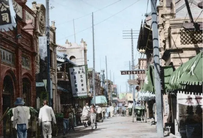 木杆挑着铁牌,字全是细长体,连电话号码都写上了,布棚子打着锯齿边,日光被切成一块块斑驳,路中间人力车靠边停,车夫低头抹汗,商家会把玻璃擦得锃亮,盼顾客从倒影里多看两眼,现在的街景更高更亮,照片拍出来是利索干净,可杂乱的生气也少见了。
