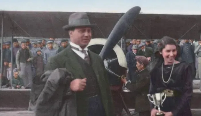 黑色螺旋桨像是大风车,旁边女士手里拎着亮闪闪的杯子,八成是奖杯,机翼拉着支撑杆,地上围了一圈看热闹的兵和市民,这玩意儿那会儿可新鲜,人人仰着脖子找影子,我小时候第一次站在跑道边,耳朵被轰得发麻,还觉得过瘾,现在航展越做越大,见怪不怪了也就不挤成一团。