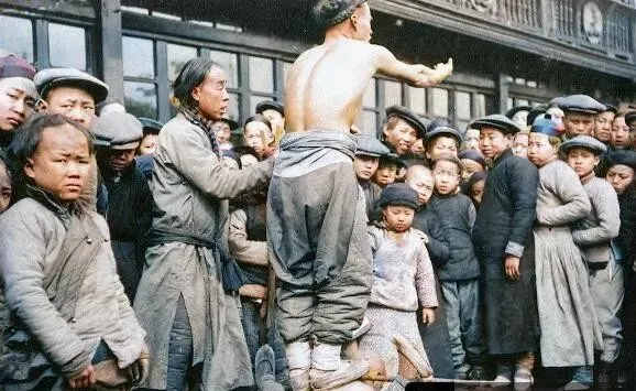 图中这位赤着背的汉子叫江湖卖艺人,旁边那位扶着他的多半是搭档,肩头裹着破棉,脚下垫一块木板当台,前排孩子睁着圆眼往上看,脸冻得通红,真有点替他哆嗦,动作一抬一伸,全靠吆喝撑场子,袖口里可能还藏着两根短棍,表演完一抱拳,搭档拎着破碗绕场收钱,铜板叮当几声就算成活了。