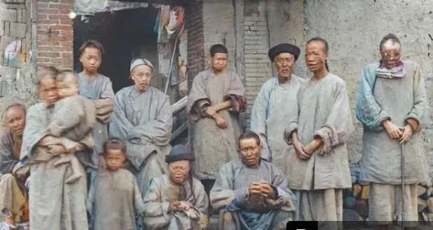 这个角落里的人被叫作麻风病人,灰墙口,破门洞,站的坐的都在,袖口长得遮住半只手,有人脸上起了硬结,有人眼神空着,靠墙那位用拐杖,裤脚卷到脚腕,露出干裂的皮,照片里看不见味道,却能想见那股药汤与潮霉混在一起的闷气。