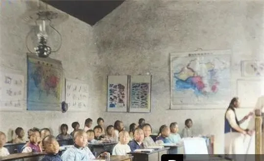 这个屋子叫学堂,泥墙糙得能刮手,前面木讲台,老师一只手扶着课本,一只手拿粉笔,墙上挂的地图颜色浅浅的,东一块西一块,孩子们坐得端正,短发麻花辫夹在同一条长凳上,灯罩像大玻璃瓶倒扣着,天亮靠窗,天黑就盯着油灯。