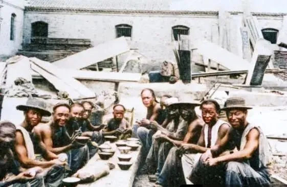 这一桌粗糙的碗,几块木料当凳,叫工地的午饭,男人们光着膀子,脸上涂了泥灰,笑得倒挺敞亮,旁边堆木板,锯末铺了一地,帽子是草编的,边沿被汗水浸得发黑,盛到碗里的,也许就是一瓢稀粥两块干饼,忙够了才叫香。