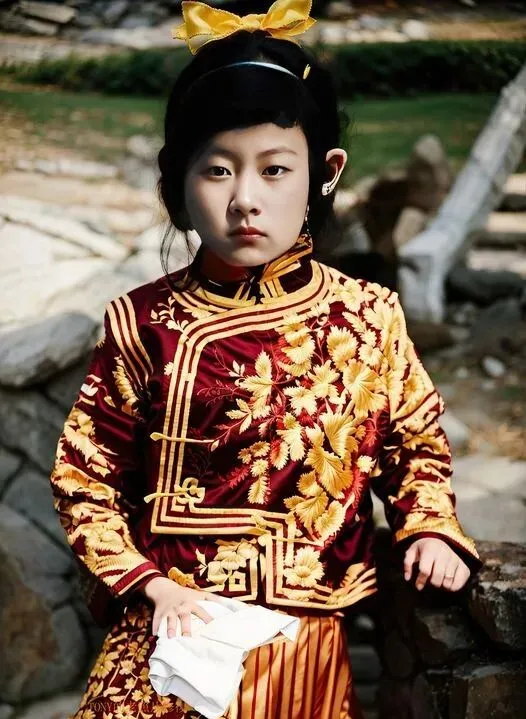 图中这位小姑娘穿的叫团龙缎面袄裙,绛红底色上压着金黄的折枝花草纹,领口是立领交襟,滚着细细的镶边,袖口包得紧,手里攥着一块雪白的手绢,她的发髻高高束起,发梳上的蝴蝶结跳得很亮,这种打扮在那会儿算规整体面,镜头里她不笑,眼神直直的,有点倔,也有点冷,这一脸劲儿你说是孩子气吧也像,可又咬着一股不认输的劲道,奶奶看见这张就嘀咕,女娃穿这么齐整,家里来客了吧,别看年纪小,规矩一点不差。