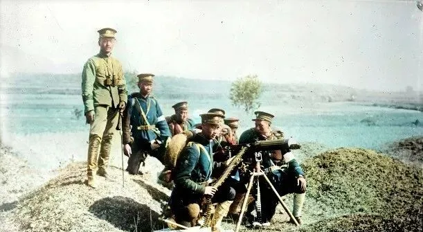 这个阵仗叫上阵摆炮,三脚架撑在土包上,机枪的弹链像蛇,盘在盒里顺出去,几个兵围着蹲着,一人手搭在扳机处,一人背着包在侧边瞭望,军服颜色不一,有新有旧,草地风大,帽檐都被吹得泛亮,他们的姿势透着股紧劲儿,喊号子不高,却沉,像压在心口的一块石头。