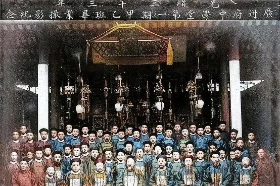 这张大合影叫新学堂的荣光,孩子们穿着素色长衫,外罩对襟马褂,站在牌楼下,牌匾上金字一溜儿发光,灯笼从梁上吊下来,粗粗的柱子把门脸撑得有气势,照片边角有些糊,能想见当时人挪来挪去找位置的忙乱劲儿,老师站在正中,眼神慈着呢。