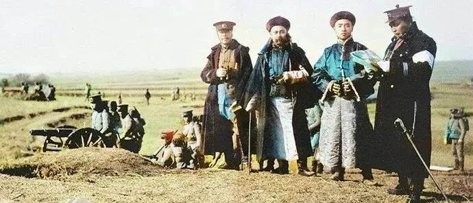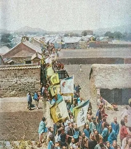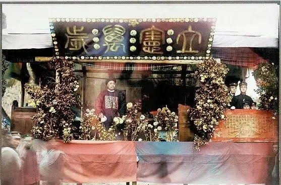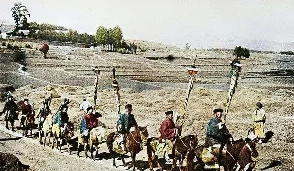 图里这串旗杆叫清道队,前头高举“清道”的旗面,后面黄龙旗跟着飘,官帽的翎子立得直,马铃在颈间响,路边的田垄密密麻麻,走一遭尘土起一片,以前官老爷出门排场大,现在开会坐车一溜烟过去,仪式感省了不少,倒也清爽。
