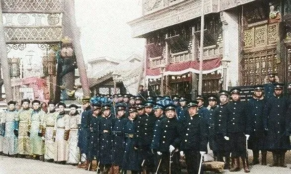 这队蓝制服叫巡警队,帽檐硬得能照出影,扣子一排排亮,手里攥着短棍,站在戏楼前沿街排开,门楣上雕花层层叠叠,边上还有穿长袍马褂的百姓探头看热闹,妈妈笑,说现在遇见警察多是路口指挥,那个时候可真是管着里外的事。