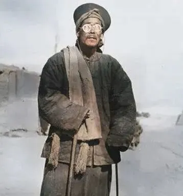 这个穿粗布褂子的叫教书先生,头上团巾,胸前斜挎旧棉围巾,最醒目的那副云片风镜,镜圈白得发亮,北地风大,戴上不至于雪沙糊眼,他手里拄根柞木杖,脚边是土路,鞋面抹着一层灰。
