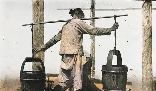 这个木桶叫水桶轱辘桶,桶肚鼓鼓的,圈着三道铁箍,提梁连着麻绳,扁担压在肩窝里,走起路来肩头一上一下,水面就跟着打花,木头被水养得发黑,桶口缘子摸上去滑溜溜的。